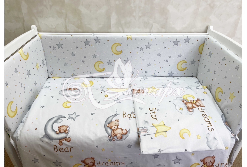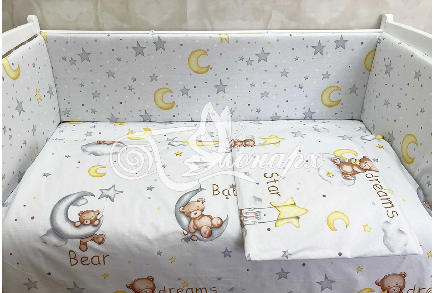 Бортики СО СЪЕМНЫМИ ЧЕХЛАМИ в кроватку: защитят Вашего малыша от ушибов, сквозняков, солнечных лучей и не дадут малышу запутаться в прутьях кроватки. - Простыня на резинке 60х120 см (подходит для стандартной кроватки)